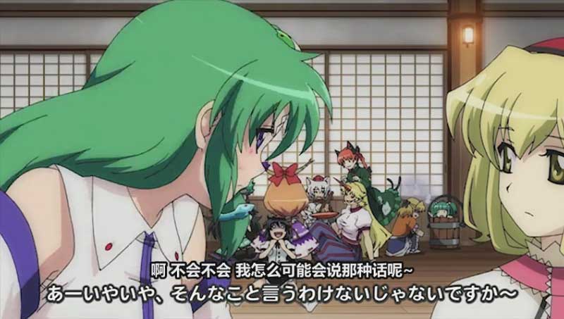 之前各种PV画面就不多说了,什么重用PV画面什么的就无视好了。宴会中各路人马悉数到场之后红魔馆一方也到场,但是姆Q也来了却有些意外。蕾米莉亚威严满满的出场,但是那小翅膀却… …同样二小姐没来,美铃这次不说是看家了,换成照顾二小姐了。咲夜人气依旧非常高的样子,第一话中表现的非常不错,这一话还故意做了柔光处理,结合ED绘确实一副完全潇洒的感觉。