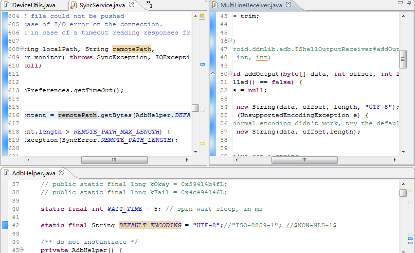 但是有一点引起我的注意。就是旧版的ddmlib在用FileListingService遍历文件的时候发现出来是乱码,测试发现返回的是ISO8859-1编码,后来我手动转换成UTF-8,之后ddmlib升级后其返回的竟然直接是UTF-8编码。于是我又回去把新版的ddmlib源代码看一遍,看完后发现ddmlib改动确实挺大的,很多地方都比之前合理了许多,但是编码问题依旧很奇怪,不明白为什么这样做,但是已经发现问题所在。