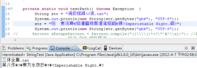 如上图所示,环境ubuntu11.10 x86,不做任何设置,可以正确显示中文和其他unicode编码的文字,并在执行包含unicode字符的命令行也不会出现Invalid argumen错误。至此可以断定adb在windows中产生Invalid argumen的原因是默认编码问题。知道原因之后就动手修改ddmlib代码。在这里需要明白另外一个问题就是路径转义,比如空格这个字符。在命令行下空格会被当做区分参数的标识,所以每个空格钱都需要添加一个\斜杠转义。参见ddmlib的实现,使用正则匹配。Pattern.compile("([\\()*+?\"'#/\s])").matcher(value).replaceAll("\\$1"),将value中的每个空格前面添加一个转义符。