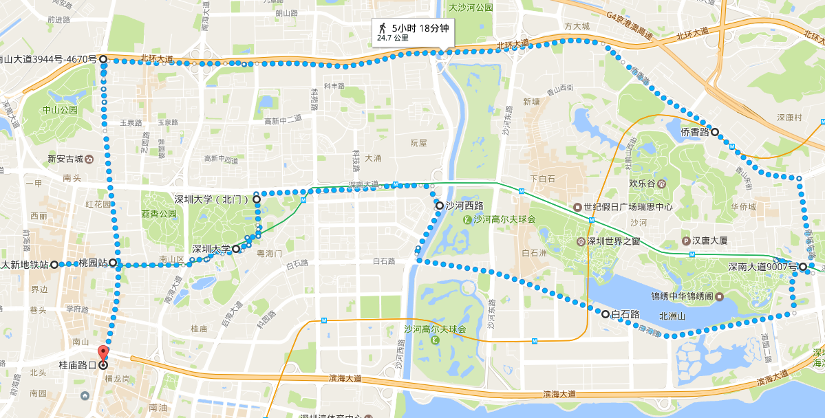然后发现在继续走就回去了,于是折返回侨香路北上至北环大道,并一路向西走到南山大道返回桂庙路口。