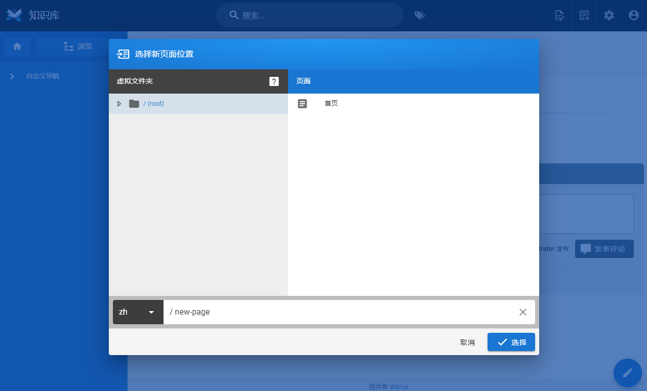 在切换到这个前端页面后点击右上角的 创建新页面 链接,弹出新建页面的位置选择对话框。这里的虚拟文件夹选项,我认为是这个系统给我的有一个眼前一亮的地方。