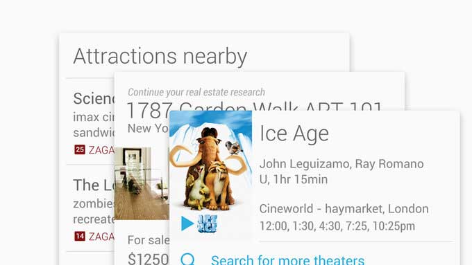 卡片第一次正式走入大家视线是Google Now的真正式发布,伴随着Google Now,我们知道了即时贴也就是Now Card。当时这种配色和外观设计,以及内容呈现方式,在我看来非常新奇,我非常喜欢。在此所说的卡片,暂时命名为Android Card。