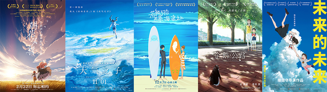 上述影片依次是《朝花夕誓》、《天气之子》、《若能与你共乘海浪之上》、《企鹅公路》、《未来的未来》