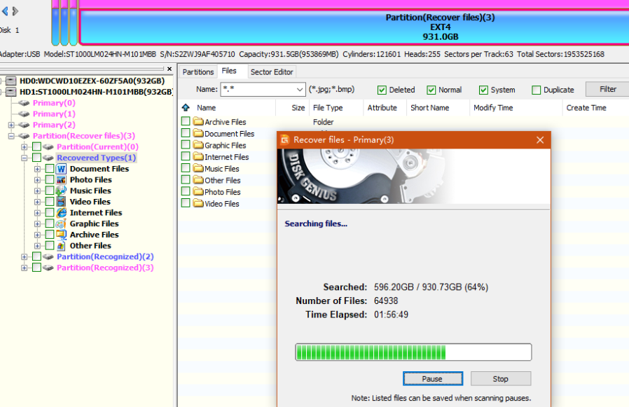第二天闪黄灯,打开R1D后台,结果显示磁盘损坏还有个恢复按钮,当时也没多想就恢复了。没想到的是恢复成功后所有数据全部清空了,我简直不敢相信,赶紧去小米论坛上查了一下。结果当时就几乎要拍桌子了,心里大骂:小米是不是做手机做傻了,系统恢复还带格盘的吗,连个提示和说明都没有。想到里面存的大量电影和电视剧都没看,再去下载就没那么容易了。把路由器拆开看发现这个1TB硬盘是挂在主板上的一个笔记本机械硬盘,随后把它拆下来接电脑上用DiskGen扫描了两个小时。在看到扫描出一堆乱码文件后觉得似乎还有救的样子。