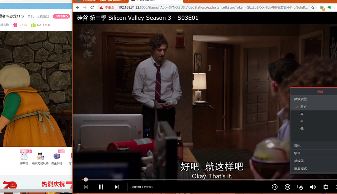 然后是最重要的播放问题,无论是WEB端还是官方android APP版本(需要改)并没有内置解码器,这主要是因为这个群晖系统使FFmpeg方案,为了播放对于一些不兼容音视频需要转码。这个据说是正版系统才有的功能,我传视频上去后也显示后台正在转码,但是都没有成功。android版也是要TV自带的解码器,我这老款的小米电视就解不了MKV一类的视频。好在可以通过安装第三方移动端的播放器,并设置软解后能看到一些专门去下载的高质量视频。比如上图这个MKV格式的重版出来我就是另外装的播放器,通过群晖的app获得网络串流设置了软件解码后播放的(其实是解码的音频)。当时非常愉快的抬着头,安静的看完了这部存了好久的《重版出来》。后来bili上了正版后又仔仔细细的看了一遍。