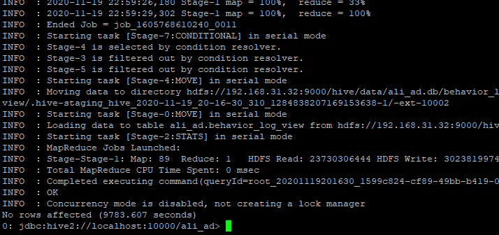 同时由于这两块板子分别是armhf结构的32位系统与arm64架构的64位系统,虽然java/pyhon这些语言都针对arm版的官方支持,但是为了先验证技术栈的可行性于是决定现在之前的黑群晖上做验证。在安装了Java,配置好一个本地单机版Hadoop和Hive后我决定先看看性能。从天池官方下载了一个22G,约7亿条数据的数据集后,将其导入HDFS,然后使用hive建表并初始化。。