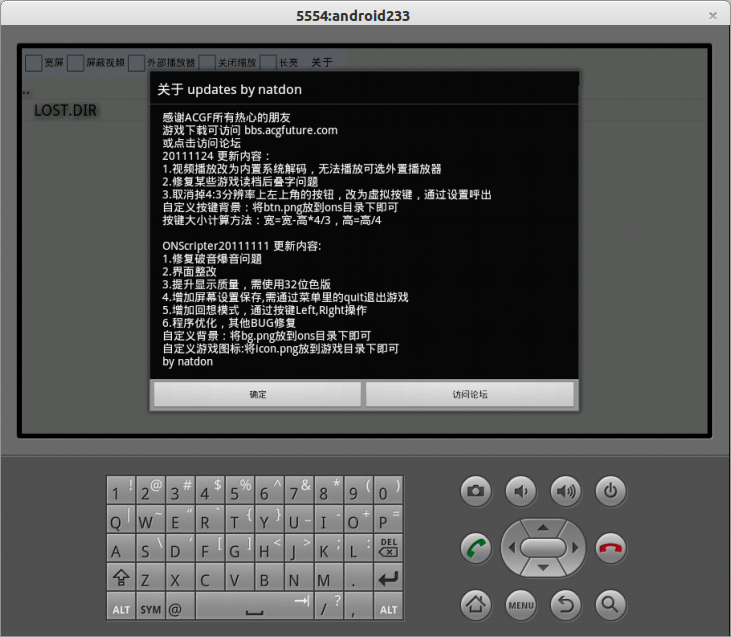 之后是Android“ONScripter on Anroid のページ”ONScripter的android方案,但是这是日文的,在中文环境下问题很多,于是国内的有爱人士接过了这个重任“ONS通用游戏引擎”,主要解决中文环境下android的AVG游戏问题,自然还有游戏移植的问题,IOS的一些问题。
