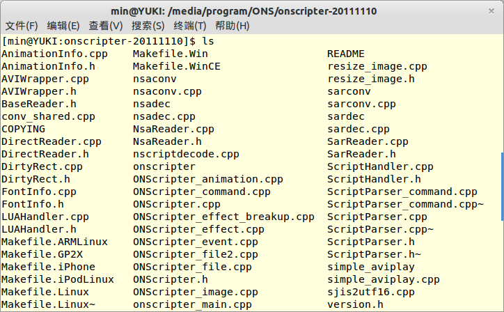接下来是NScripter的开源实现“ONScripter page”,ONS的基础。这个是全平台的ONScriper解决方案。之所以可以全平台,是因为使用SDL(详细介绍可参看上段CSDN文章),文件列表如下,在linux下使用make -f Makefile,Linux进行编译,当然要满足官方规定的一些依赖关系。