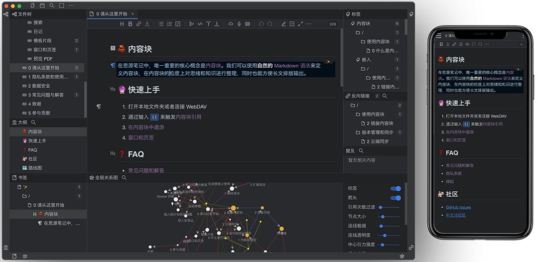 第一次看到思源笔记我是非常吃惊的,它几乎做出了一些备受好评的笔记系统应用有的功能。漂亮的所见即所得,块级引用、双链网状结构,思维导图等等。