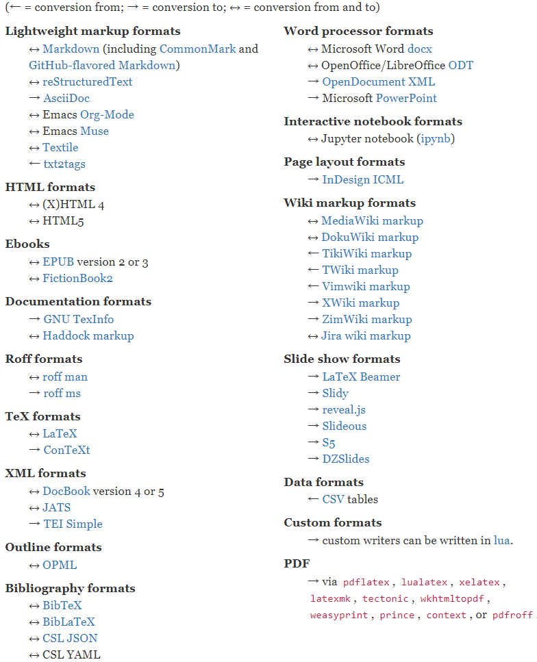 后端对文档的处理和很多时候也是非常头痛的,特别的Office这种。虽然很多语言对Office文档都提供解析,有如Python之类处理Excel相对简单便捷的,也有像Java领域Apache POI这种功能较强但是难用的飞起的库。特别是Java这边基本每一种文档的解析都有强大但是难用的工具,这其中还有各种各样的坑。这里就不得不推荐一个通用的非常强大的文档装换工具pandoc(Github)/pandoc(Web)。当然这也不是万能的,遇到不支持的还是要乖乖的自己解析。