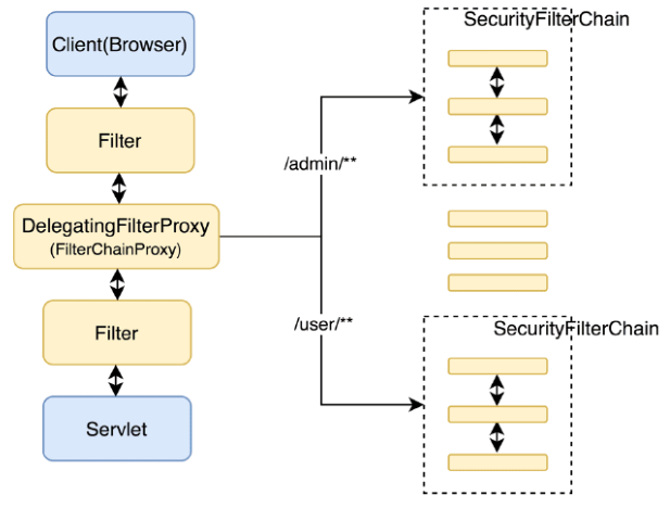 我想大部分提到 spring-security 的地方都会出现这个图,就像这个图所描述的那样 spring-security 是一个基于过滤器 Filter 实现的框架。在 spring-web 核心模块内增加了 spring-security 的核心过滤器 FilterChaniProxy ,再由这个过滤器分发请求到框架内部的 SecurityFilterChain 中。在此基础上我们自己实现的各种逻辑最终都是由各种保存在 SecurityFilterChain 中的各种过滤器实现的。