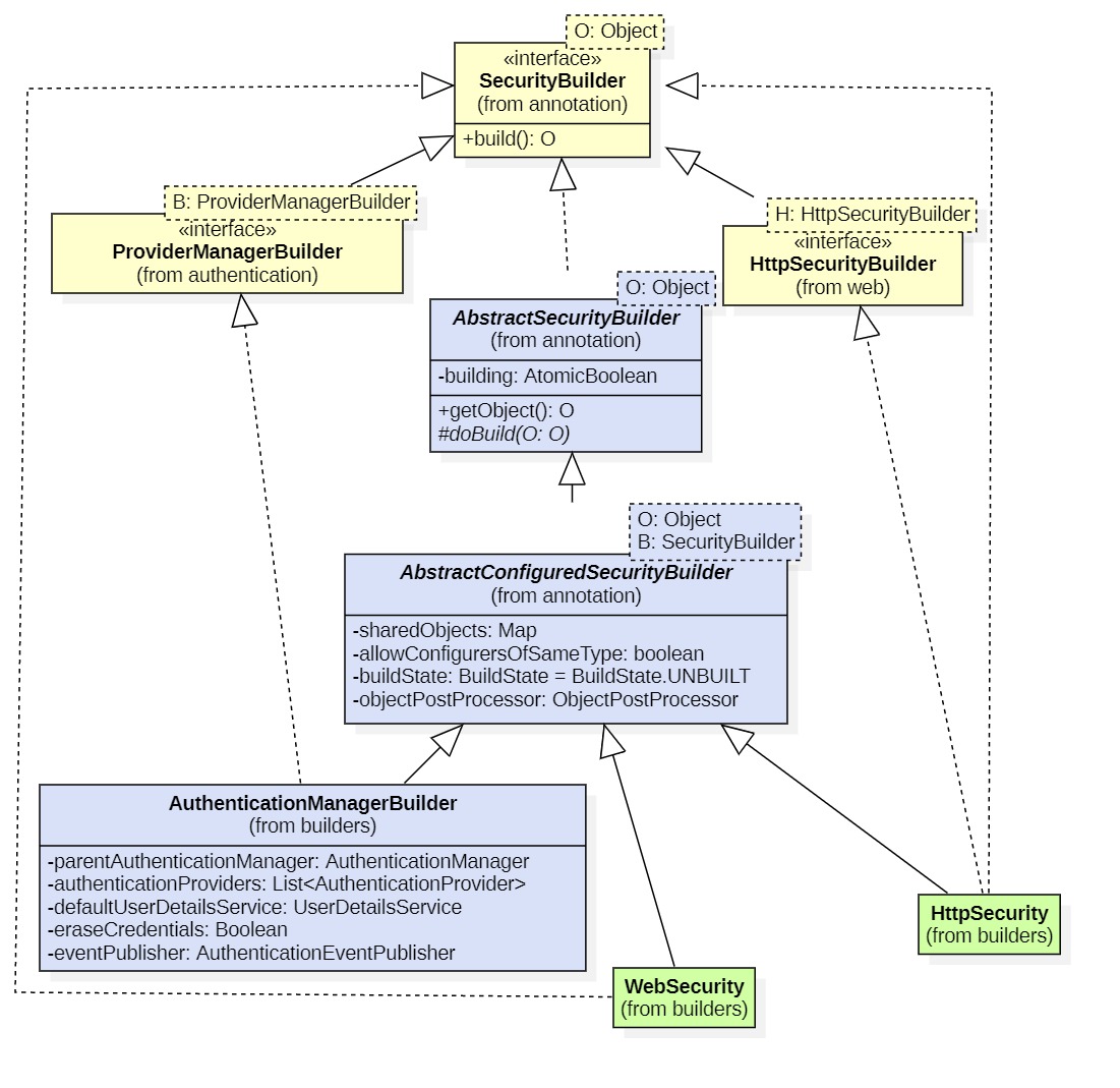 我觉得使用了建造者模式的 SecurityBuilder 可能是一开始接触 spring-security 印象较深的概念。这里罗列一下接触框架逻辑时可能需要注意的一些概念: