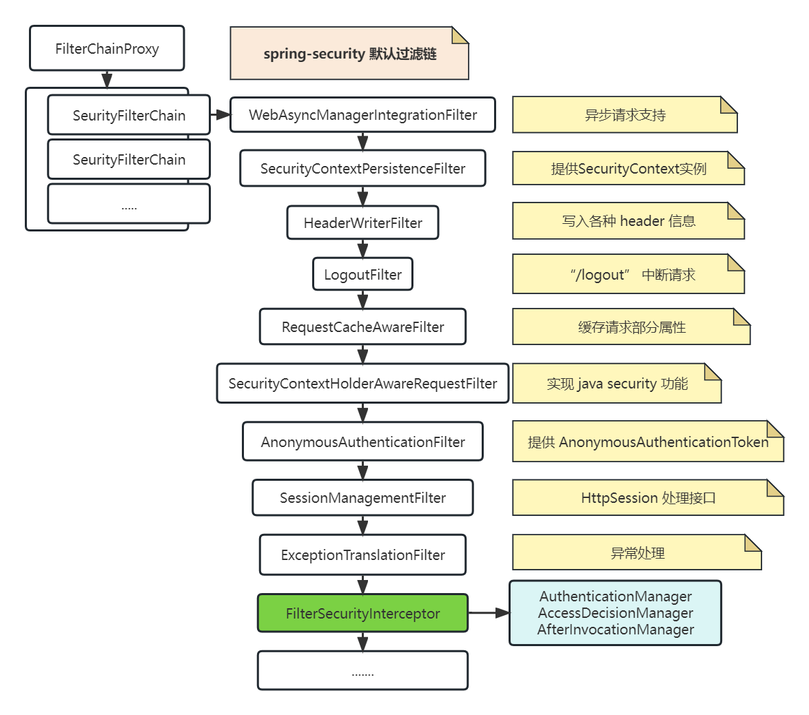 如上图所示在框架启动后,spring-security 增加了上述十个过滤器,这些过滤器是实现 spring-security 功能的基础。